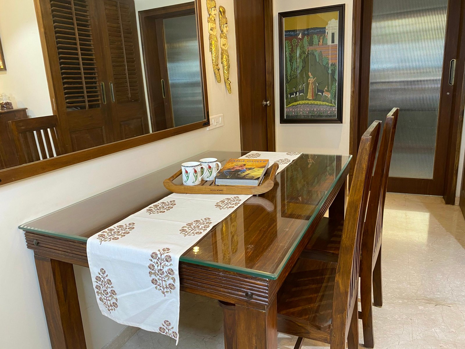 We have worked out the right table runner dimensions for your dining table. Our table runners come with a width of 13”. This will leave enough space on either side of the table so that your place settings don’t overlap with your runner.