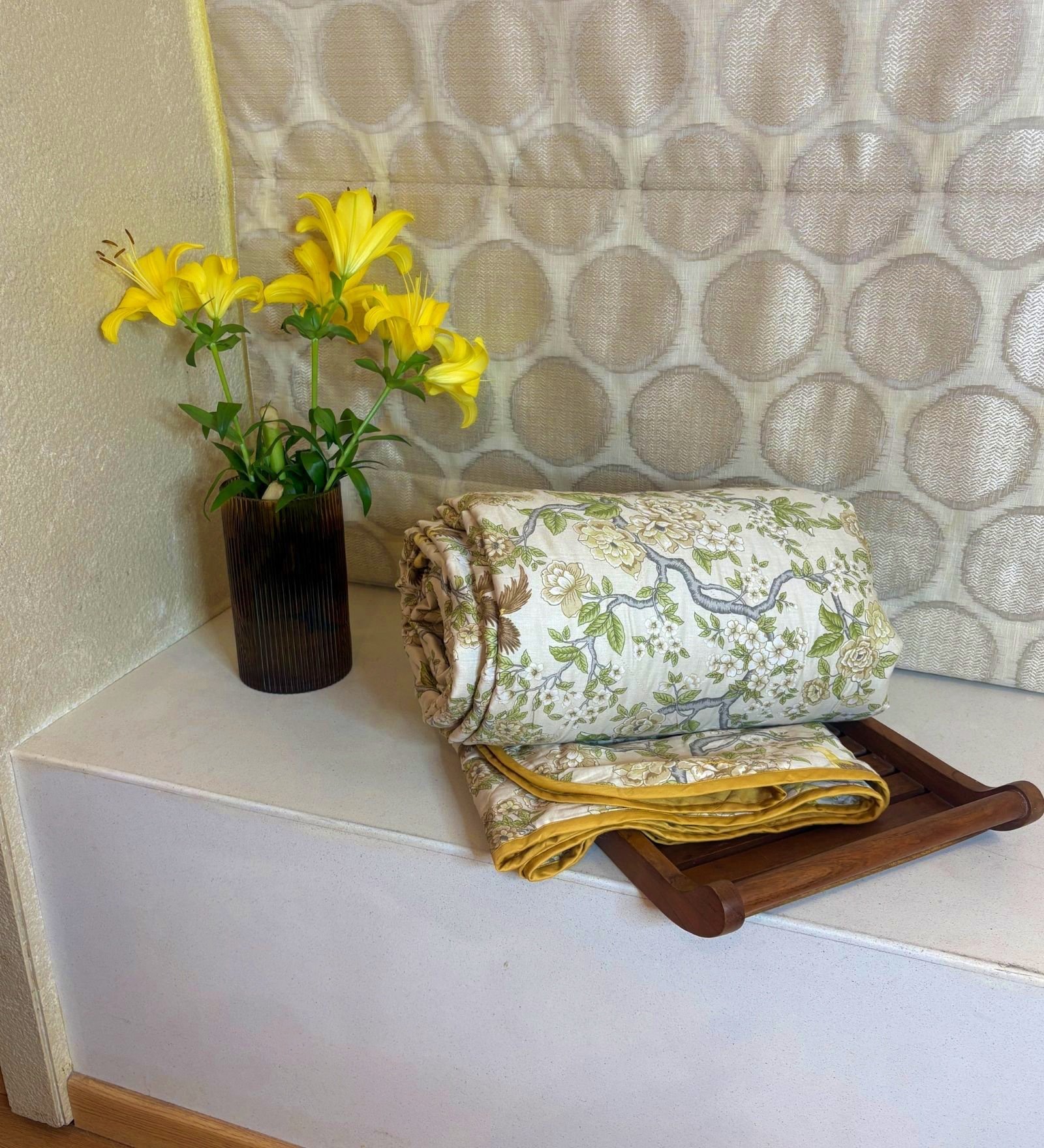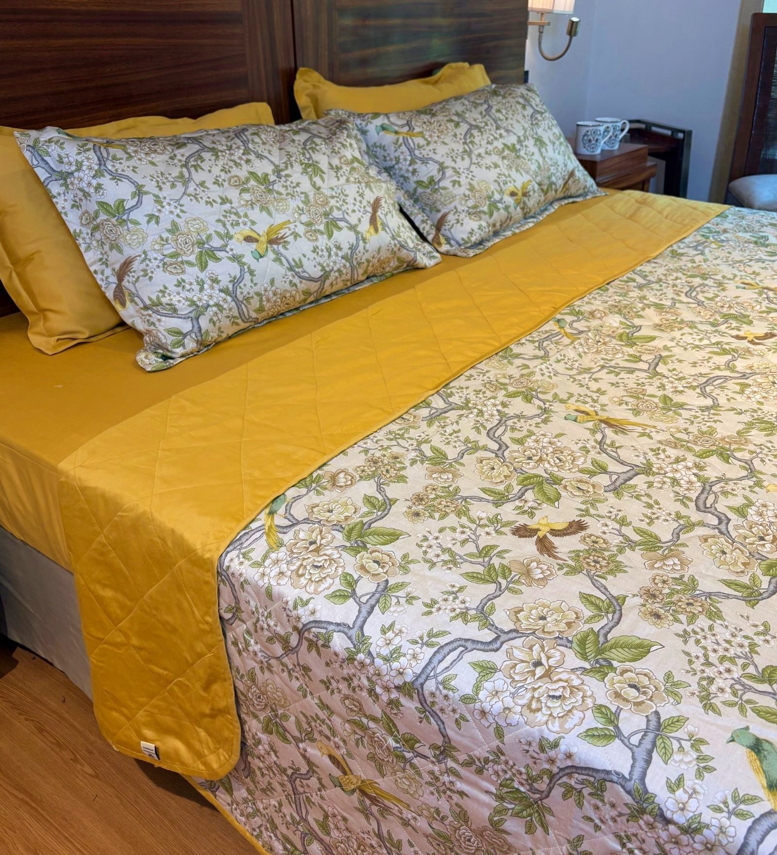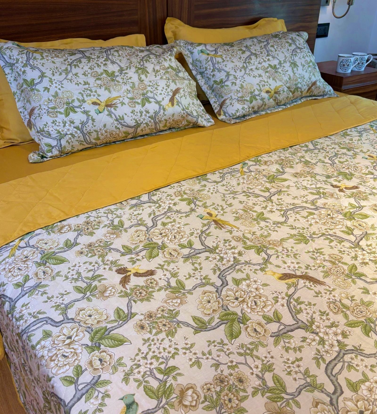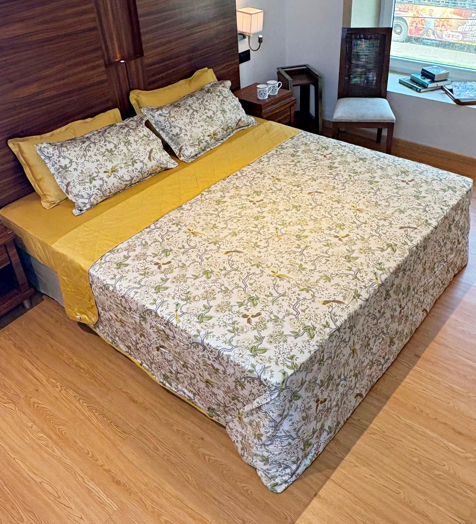 Bring refined charm and understated luxury to your bedroom with our reversible AC comforter cum quilted bedcover. One side flaunts a rich solid hue for a bold, contemporary vibe, while the reverse showcases an exquisite botanical print with birds and florals in soft, colourful tones — perfect for a nature-inspired look. Lightly quilted for comfort and crafted for year-round usability, it drapes beautifully as a bedspread while doubling as a breathable comforter on cooler nights. A statement piece that seamlessly blends utility with timeless style.