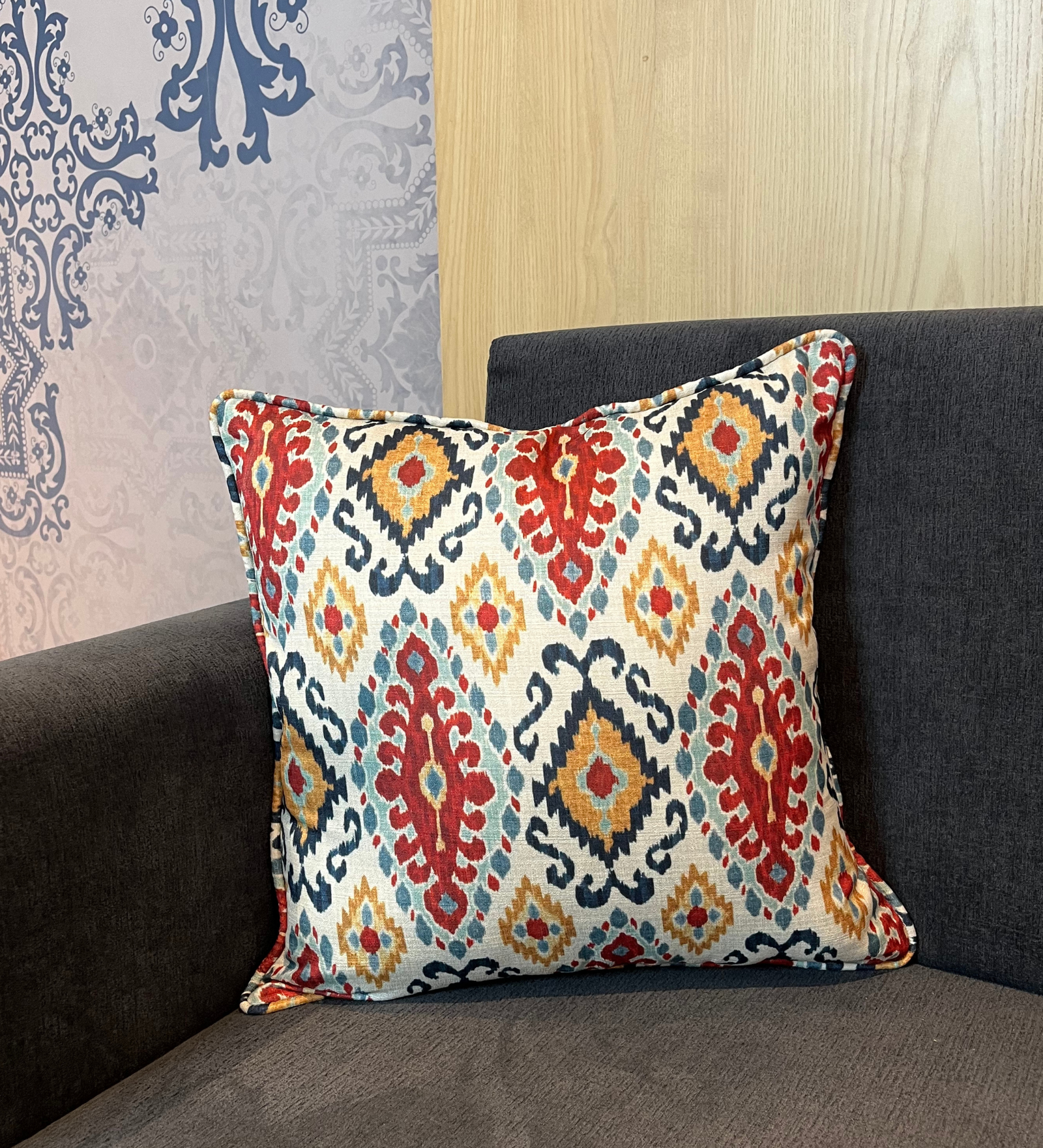 Our Ikat print cushion covers bring a touch of global charm and artistic elegance to any living space. These silk covers are adorned with the mesmerizing patterns of ikat a time-honoured textile technique that involves meticulously dyeing threads before weaving to create the characteristic blurred and dynamic designs. Ikat print cushion covers are a perfect way to infuse vibrancy and personality into your home decor. The colour combinations and intricate motifs makes it easy to find a design that complements your style and colour scheme. Whether used as accent pieces on a sofa, chair, or bed, these covers effortlessly blend traditional craftsmanship with modern aesthetics, adding a dash of cultural richness to your interior while simultaneously providing comfort and visual appeal.