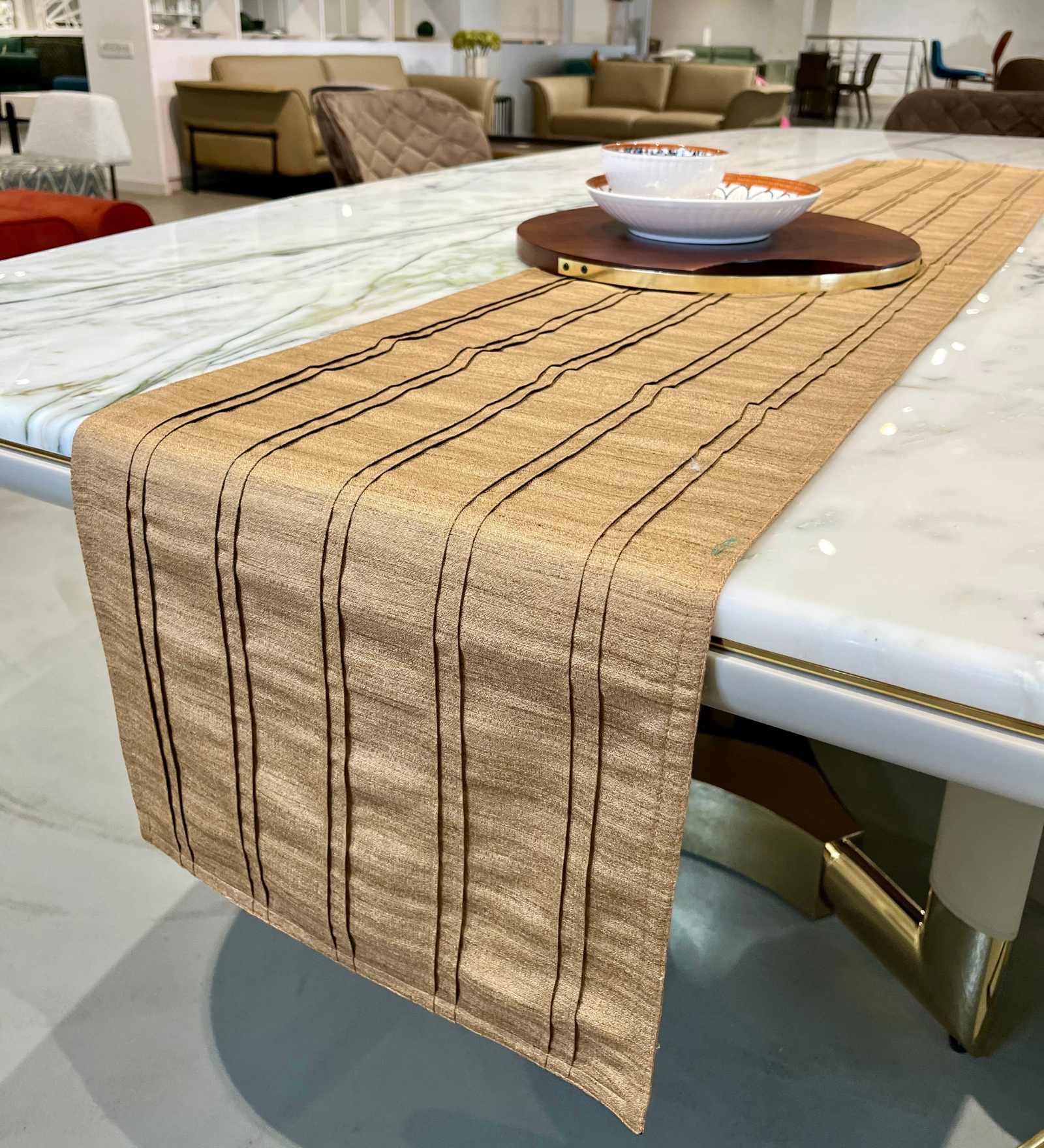 We have worked out the right table runner dimensions for your dining table. Our table runners come with a width of 13”. This will leave enough space on either side of the table so that your place settings don’t overlap with your runner.