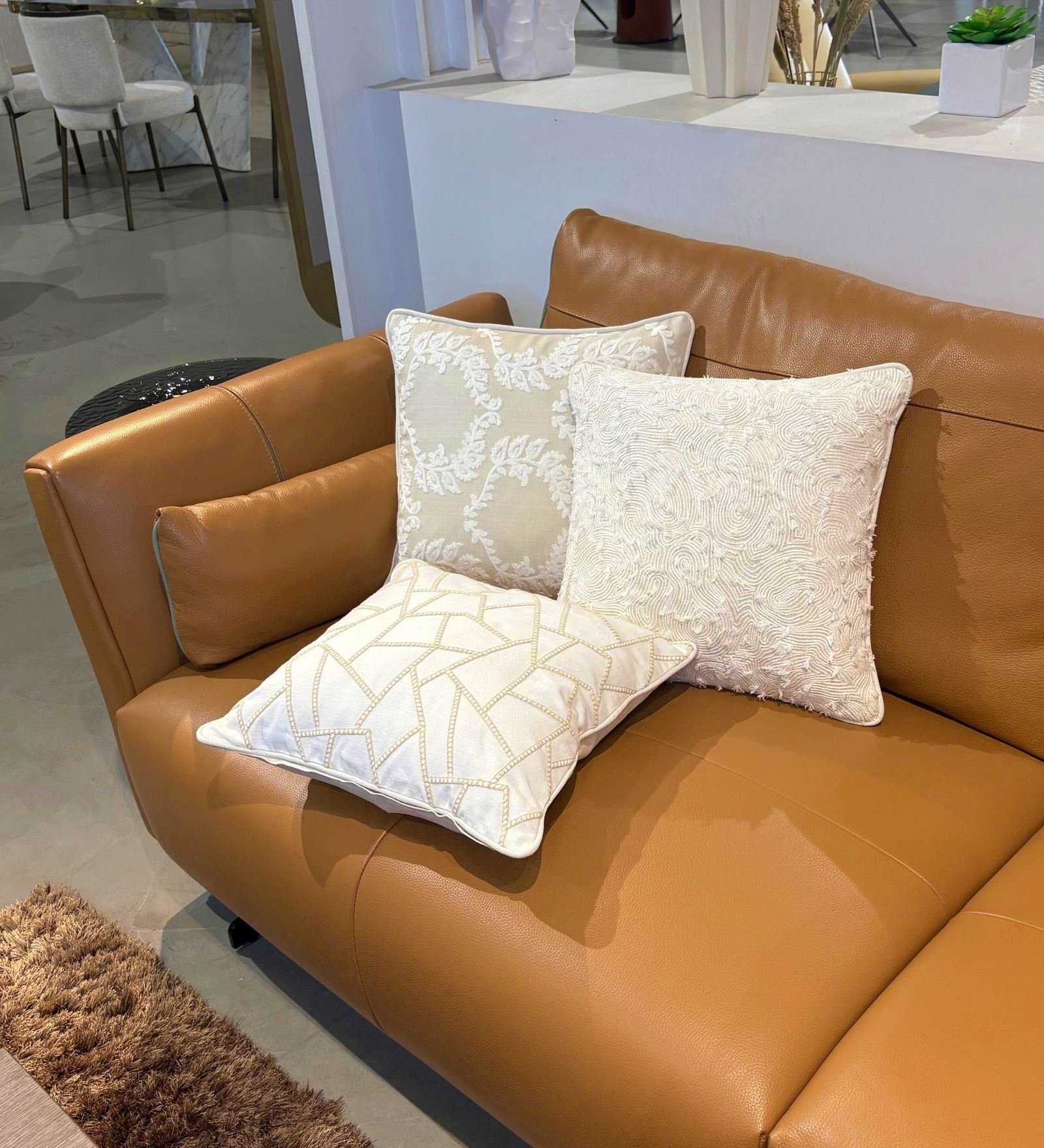 When styling your cushions this season, consider adding texture to elevate the look. Pair natural fabrics or intricately patterned and embroidered cushion covers with neutral tones to create a soft, balanced contrast that instantly brings life to your space. Start with our signature powdered and neutral Season of Light collection. Layer in our embroidered cushion covers—featuring Floral and Lattice designs—for a relaxed, inviting summer breeze vibe.