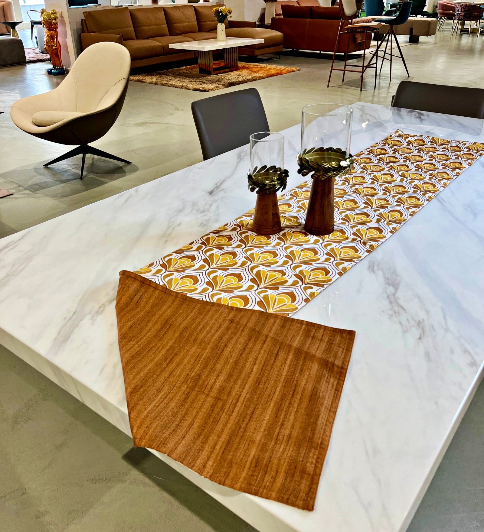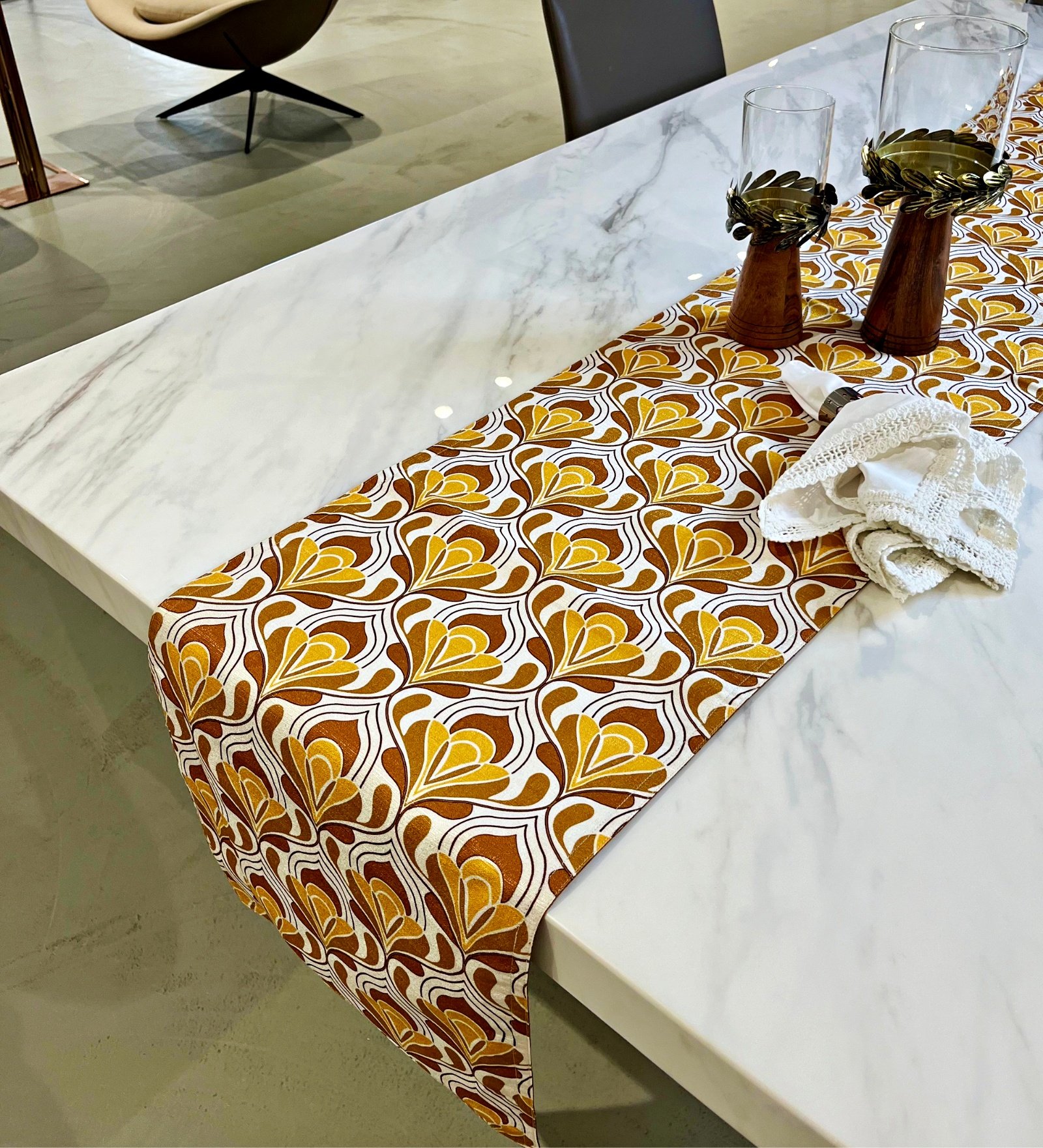 We have worked out the right table runner dimensions for your dining table. Our table runners come with a width of 13”. This will leave enough space on either side of the table so that your place settings don’t overlap with your runner.