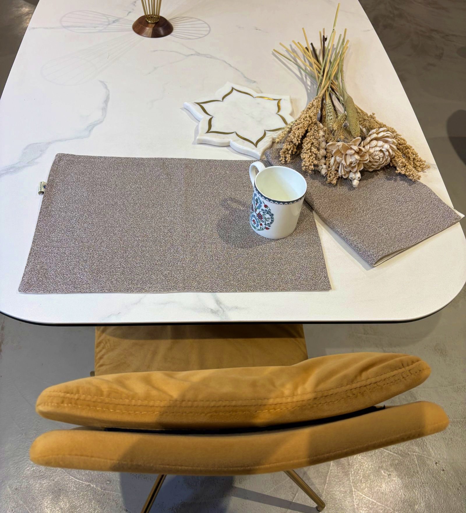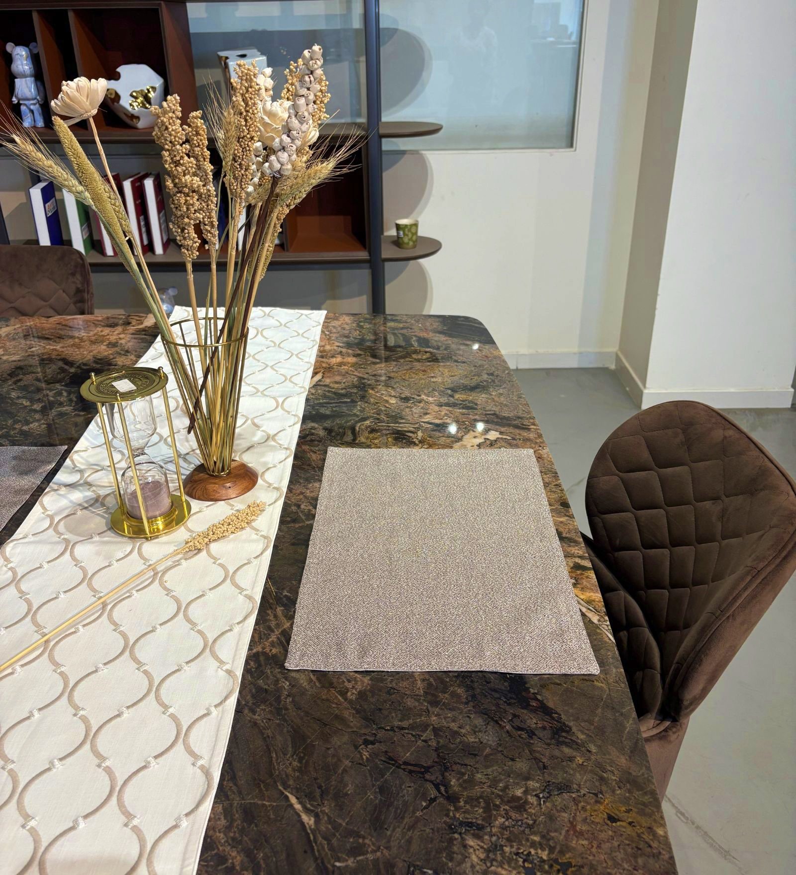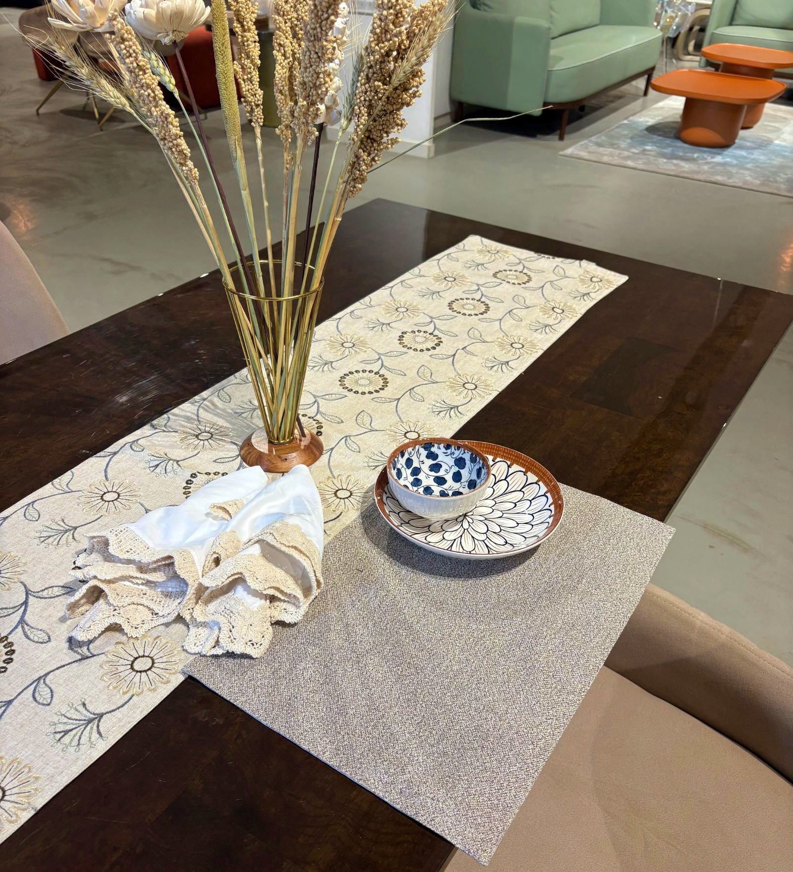 We have worked out the right table runner dimensions for your dining table. Our table runners come with a width of 13”. This will leave enough space on either side of the table so that your place settings don’t overlap with your runner.