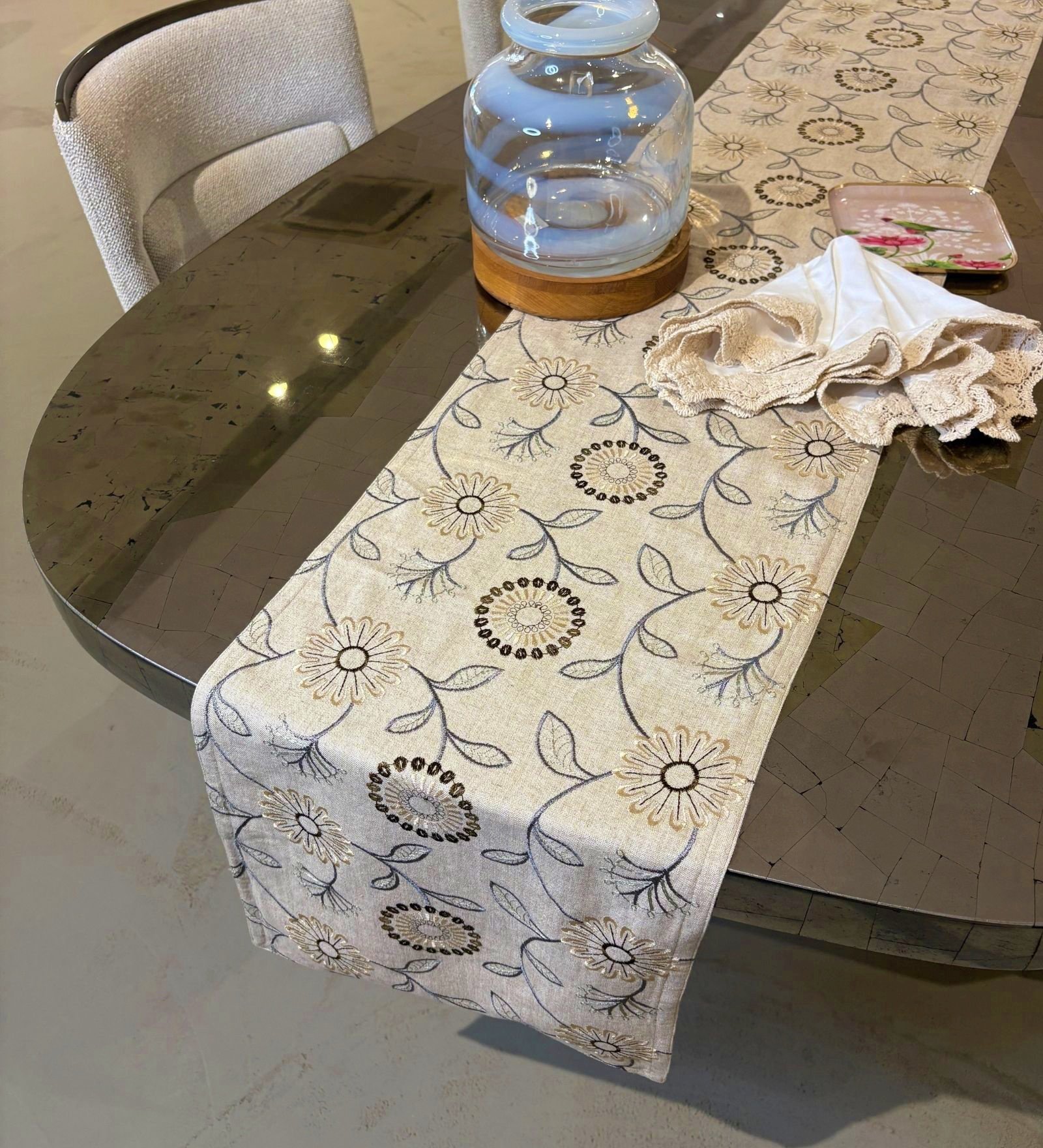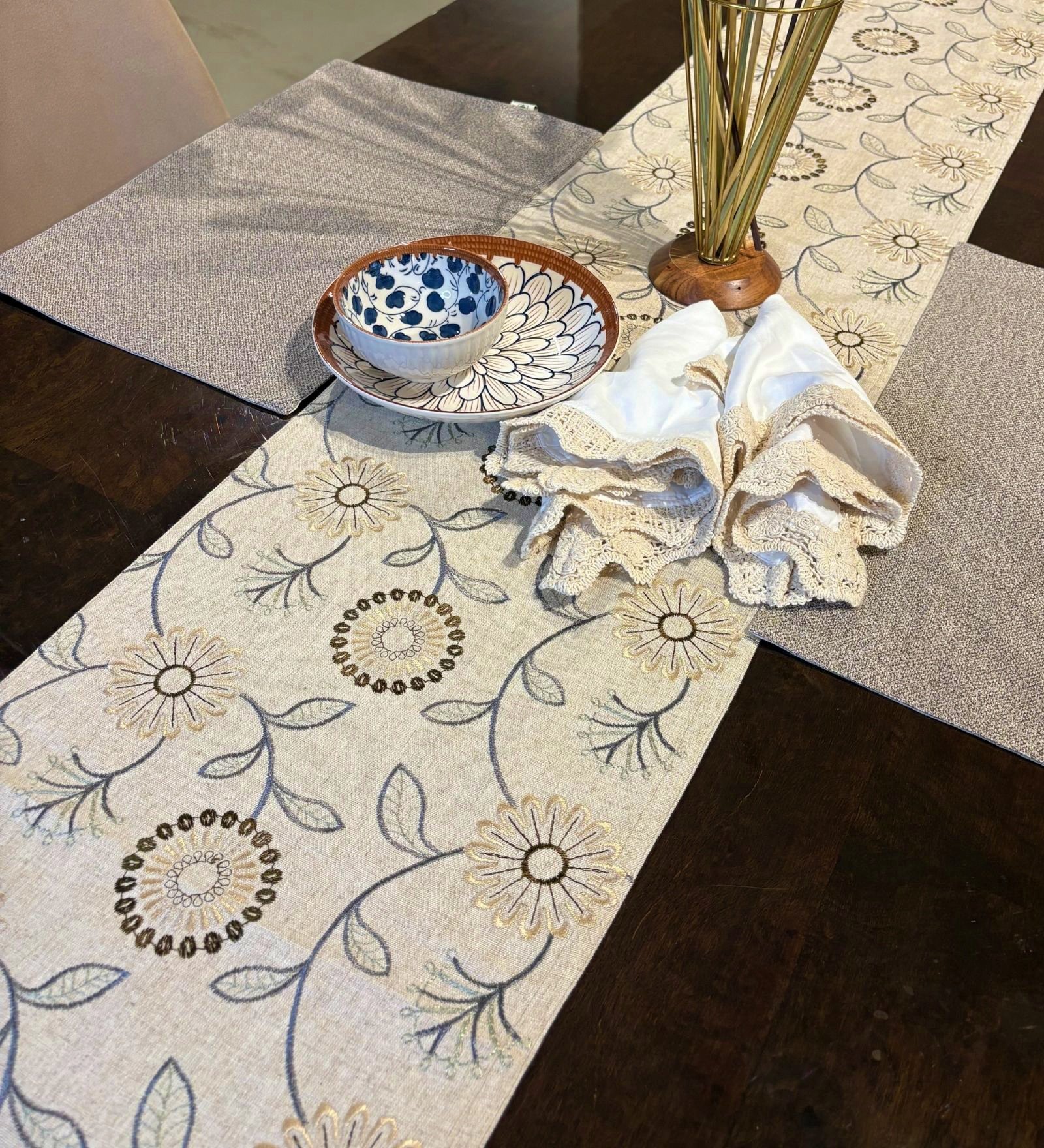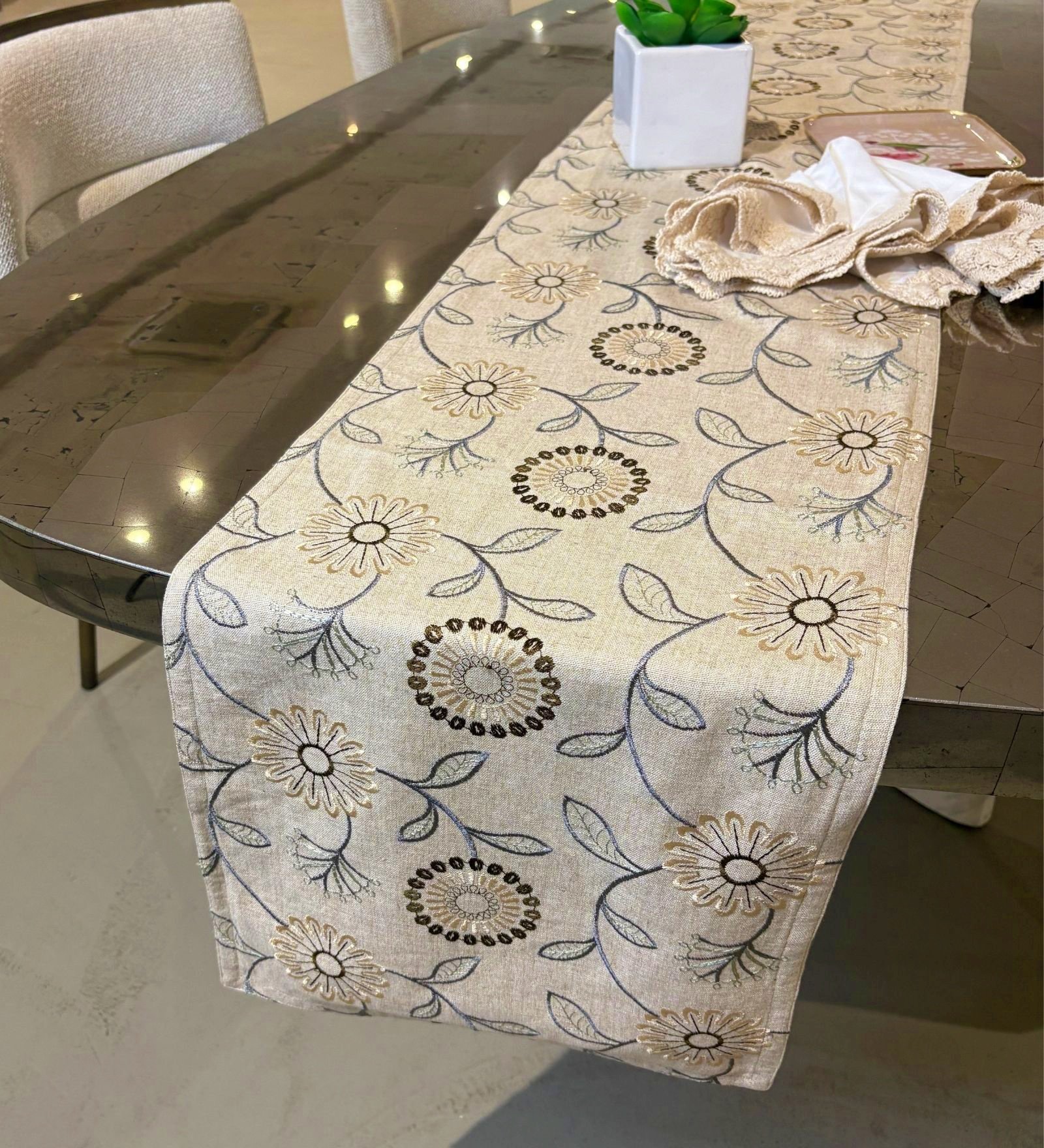 Style your tables this season with elegant layers. Our neutral-toned Season of Light table runners, elevates your dining space with embroidered Floral and Lattice patterns. Natural fabrics and detailed embroidery pair beautifully with understated palettes, creating a setting that’s graceful, warm & welcoming. Whether it’s a casual brunch or an evening soiree, these layered accents add an easy summer-ready charm. Transform everyday dining into a visual treat with textured table runners that blend craftsmanship with a homely elegance.