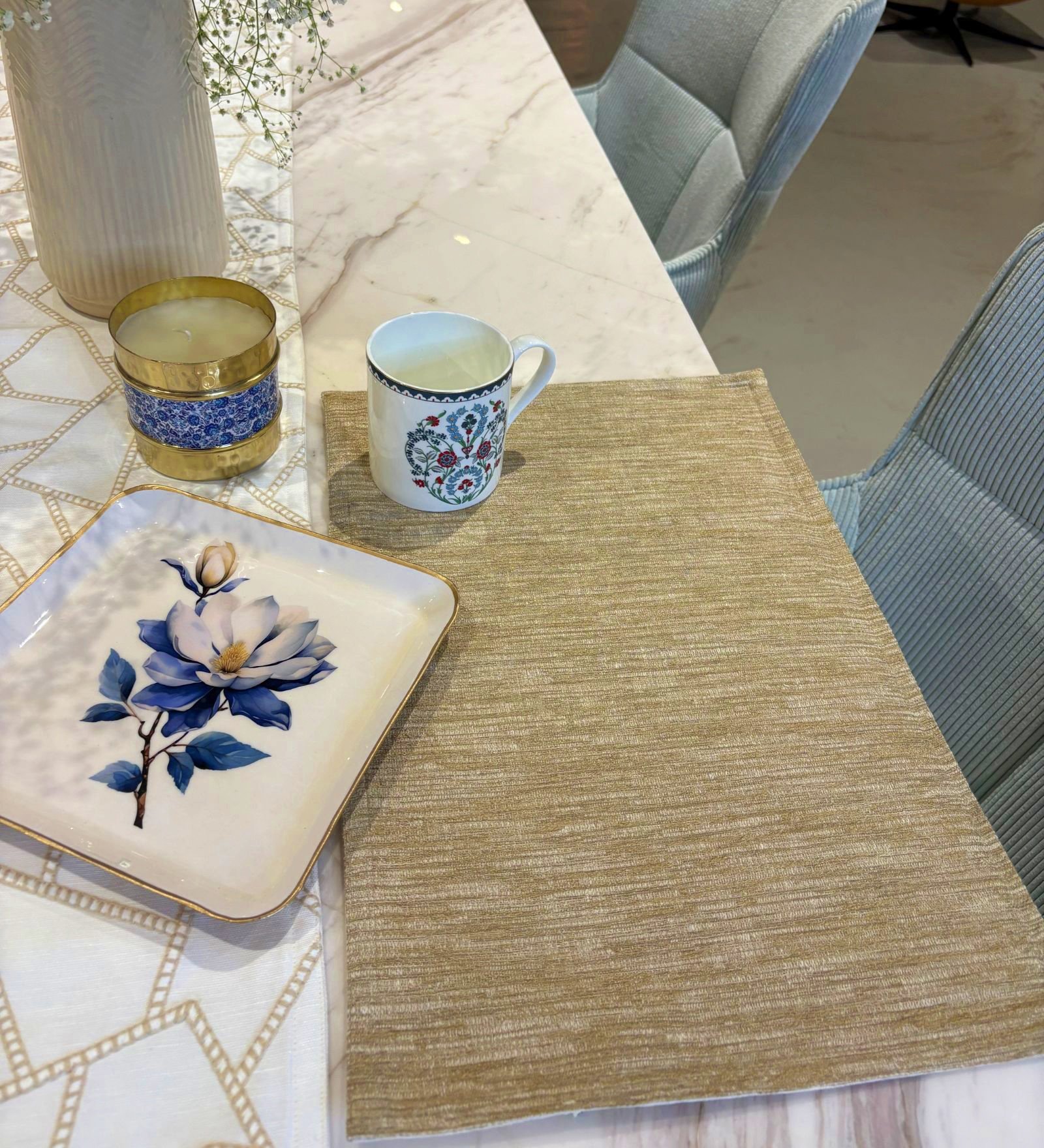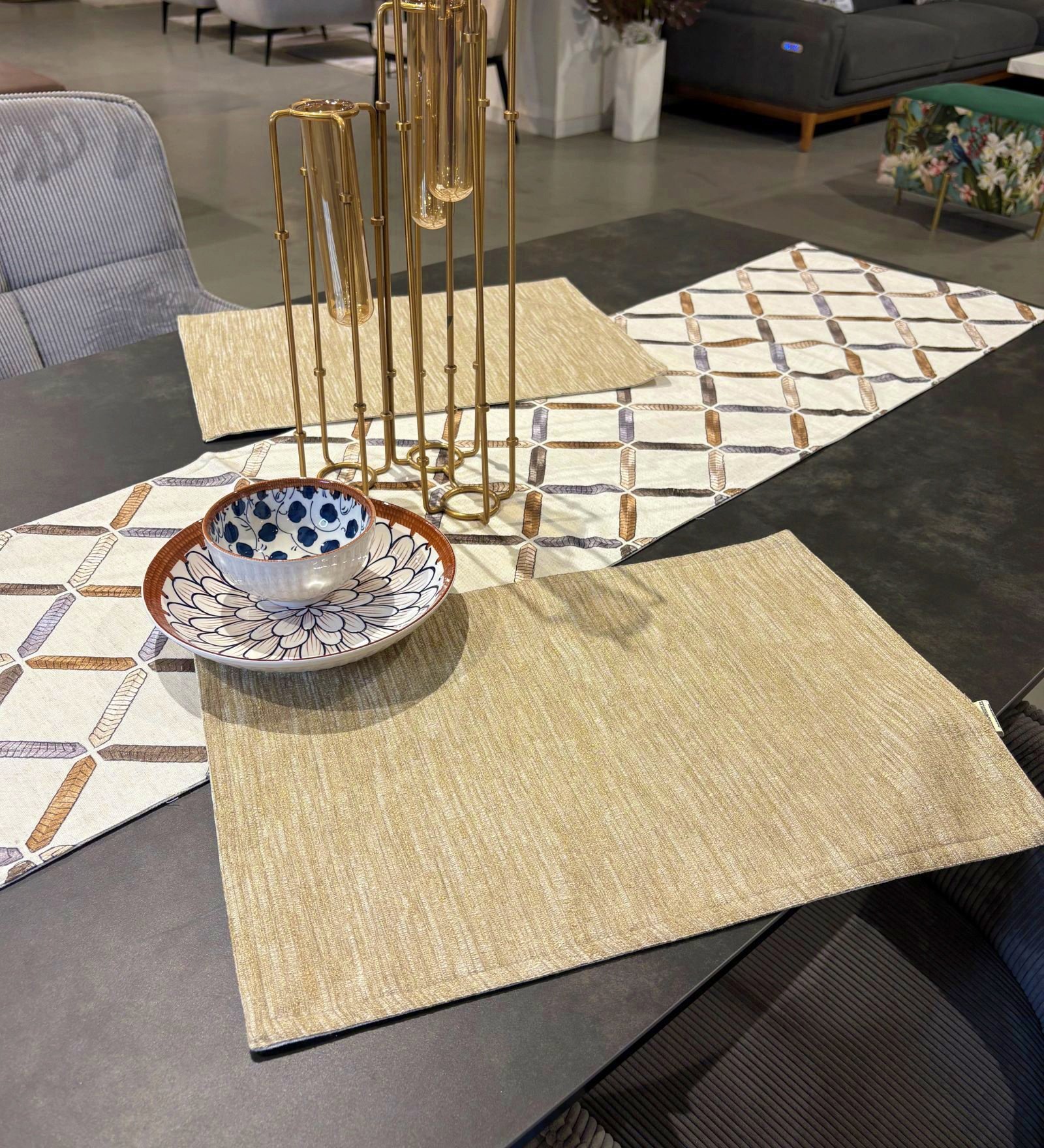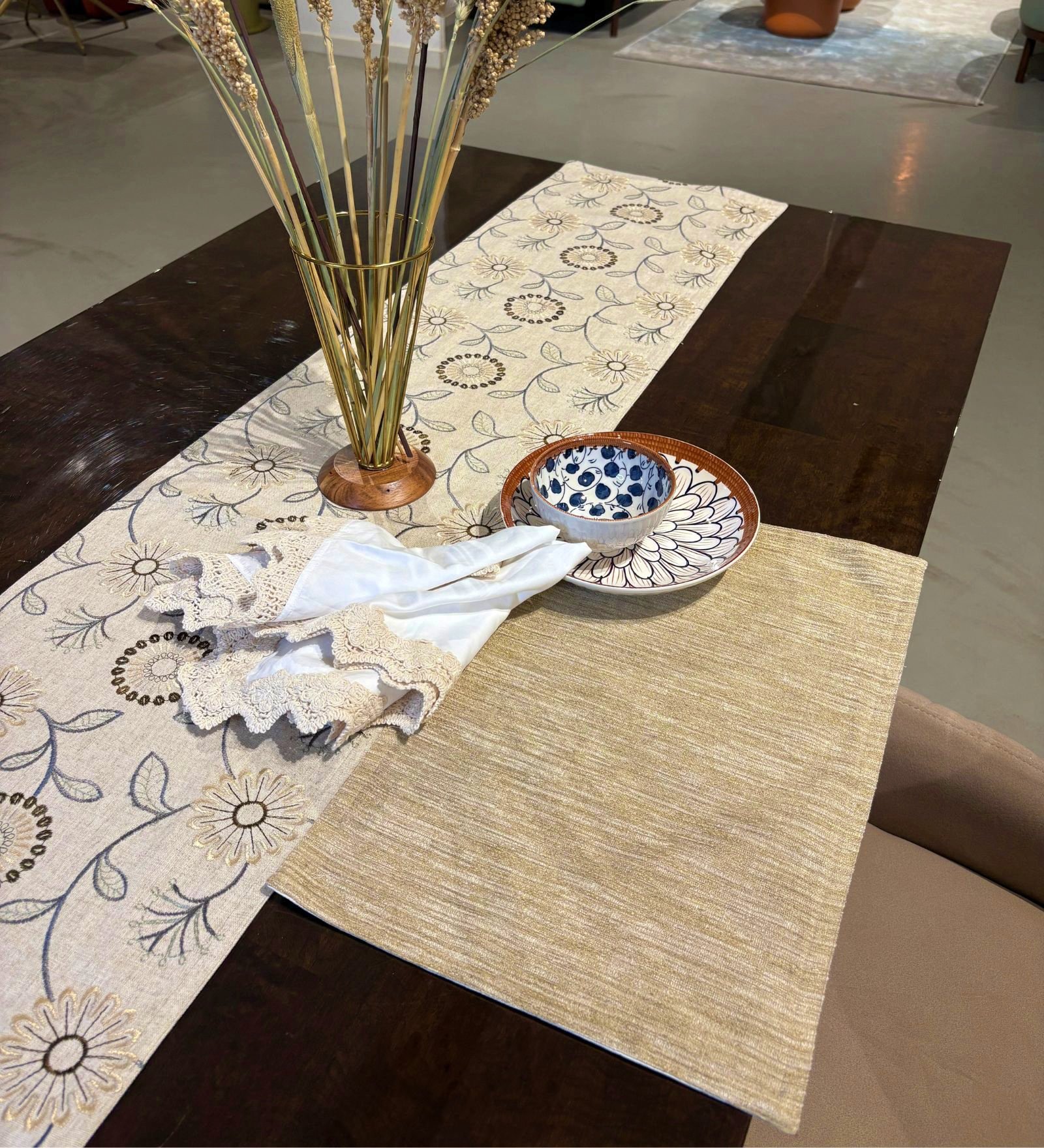 We have worked out the right table runner dimensions for your dining table. Our table runners come with a width of 13”. This will leave enough space on either side of the table so that your place settings don’t overlap with your runner.