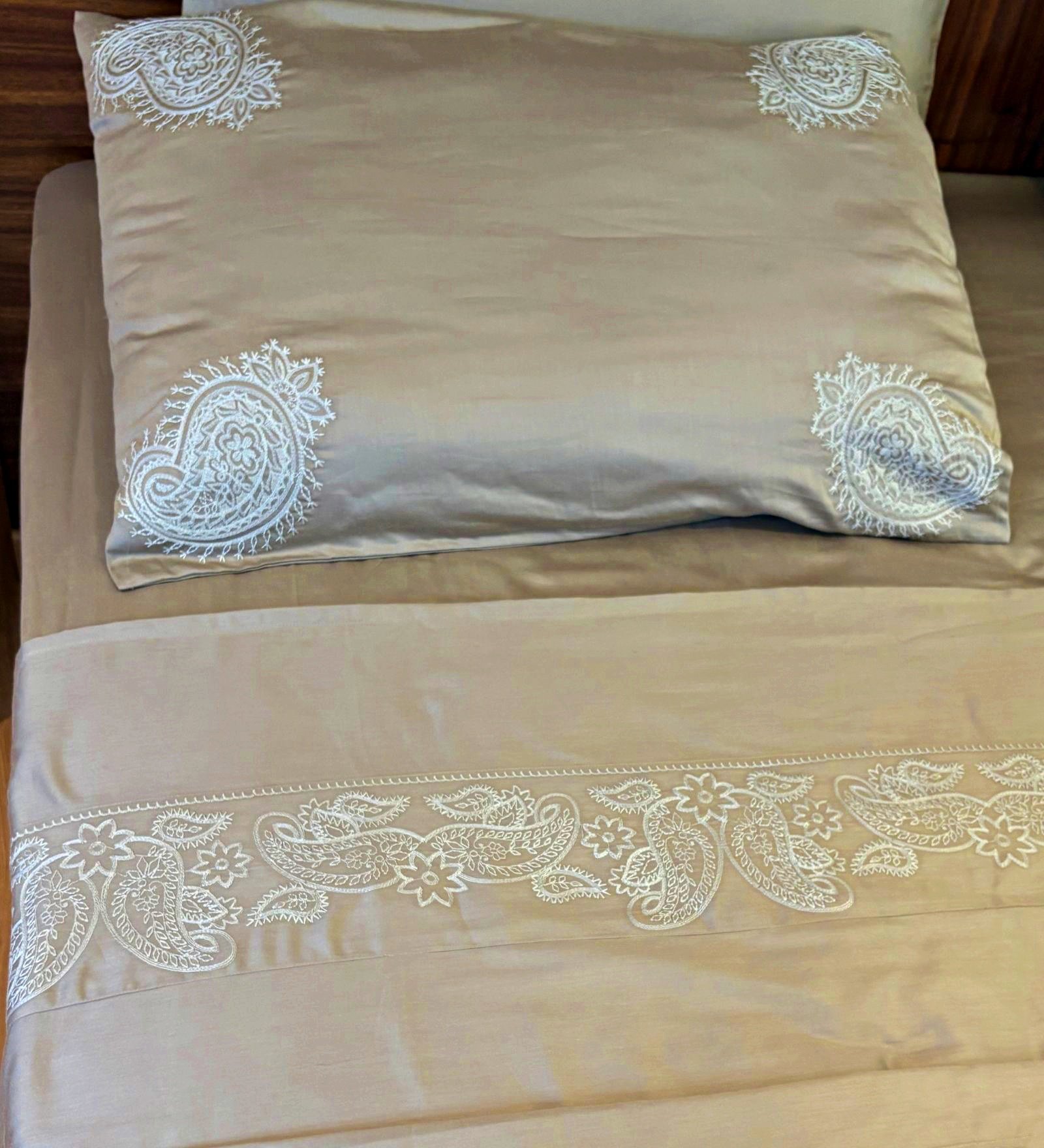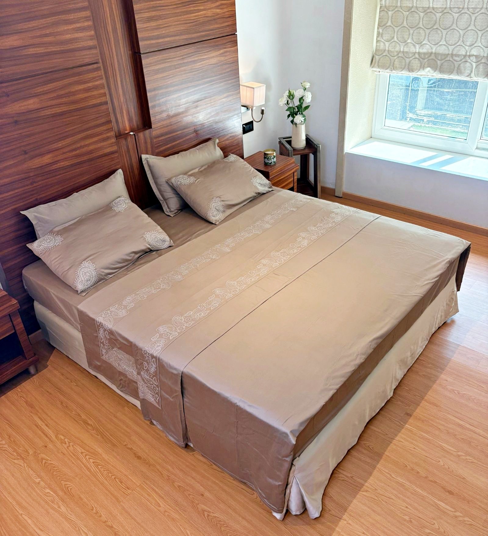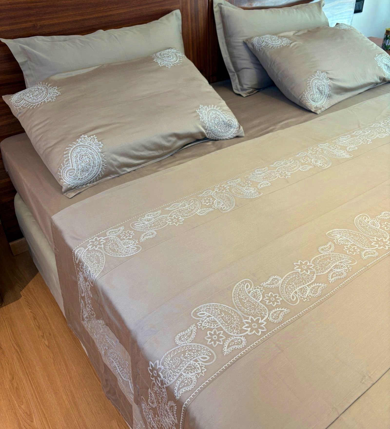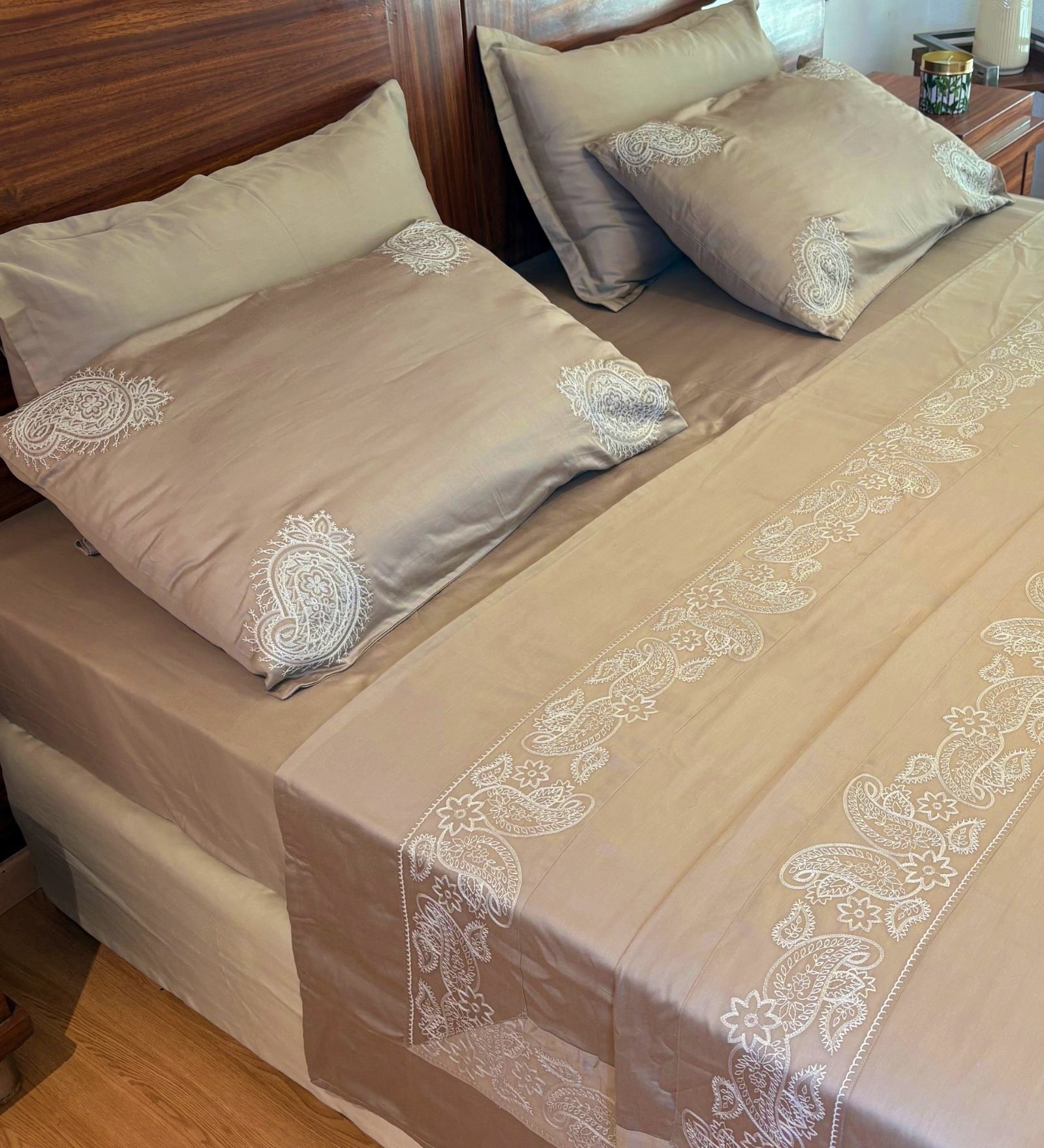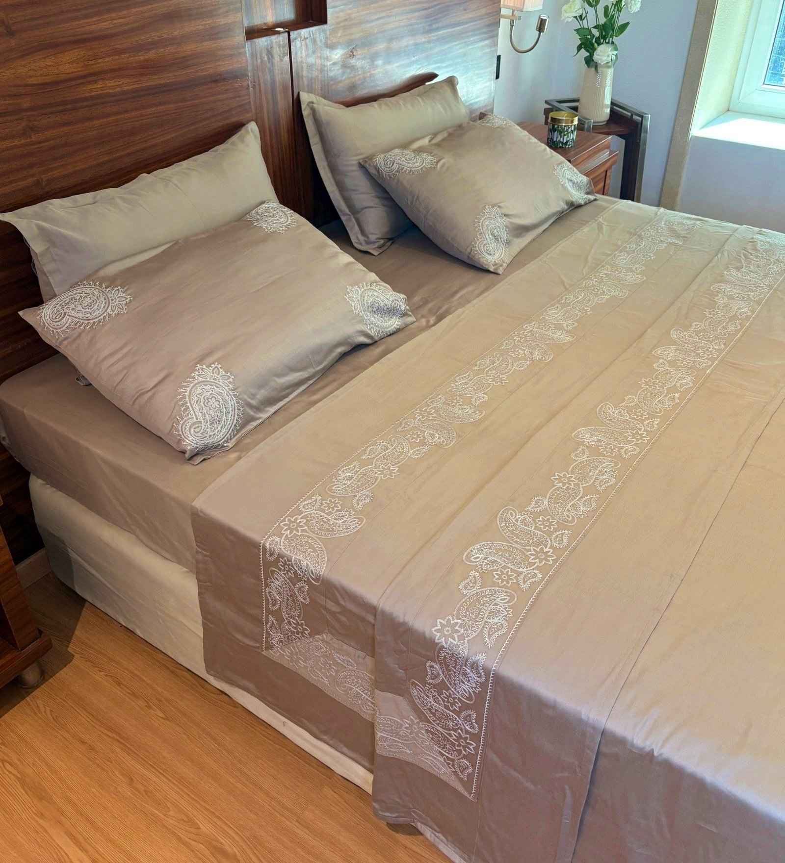 Radiant Calm — where artful detail meets indulgent comfort. Our richly embroidered sateen bed covers, adorned with intricate embroidery, is the epitome of quiet luxury. The ornate floral & paisley patterns bring in a touch of baroque elegance while the silky sheen of the fabric reflects light beautifully, creating a warm and inviting atmosphere. Perfect for elevating both traditional and modern interiors, this piece transforms your bedroom into a space that feels regal, yet restful. Style it with fresh florals, wood accents, and minimal decor to let the embroidery take centre stage.