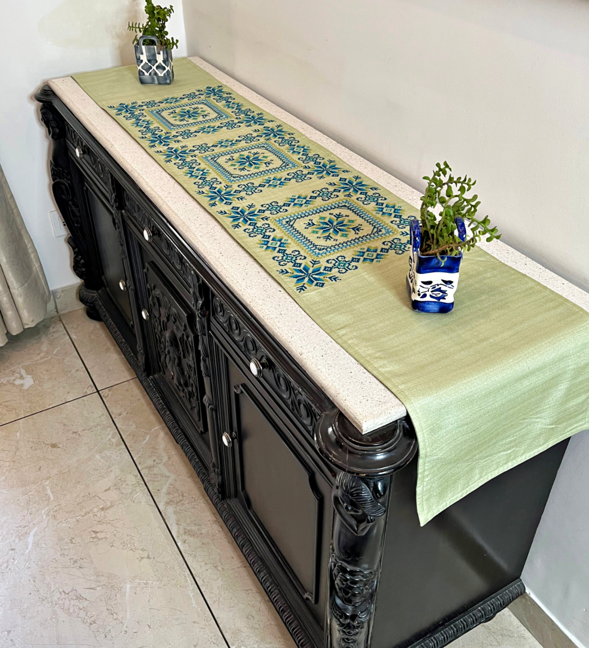 Cross-stitch embroidery runners are a charming way to bring a touch of elegance and artistry to tabletops and furniture. Our Cross-stitch silk runners, delicately adorned with intricately stitched patterns, exude a sense of timeless craftsmanship and style. They can be tailored to suit a variety of occasions and themes, whether it’s a festive holiday dinner, an intimate family gathering, or everyday dining. These silk blend runners not only protect surfaces but also add a layer of visual interest and personality to the decor. Their intricate designs, often incorporating traditional motifs or contemporary patterns, reflect the dedication and patience of the craftsperson. A well-chosen runner can elevate the entire ambiance, creating a warm and inviting focal point for any space.