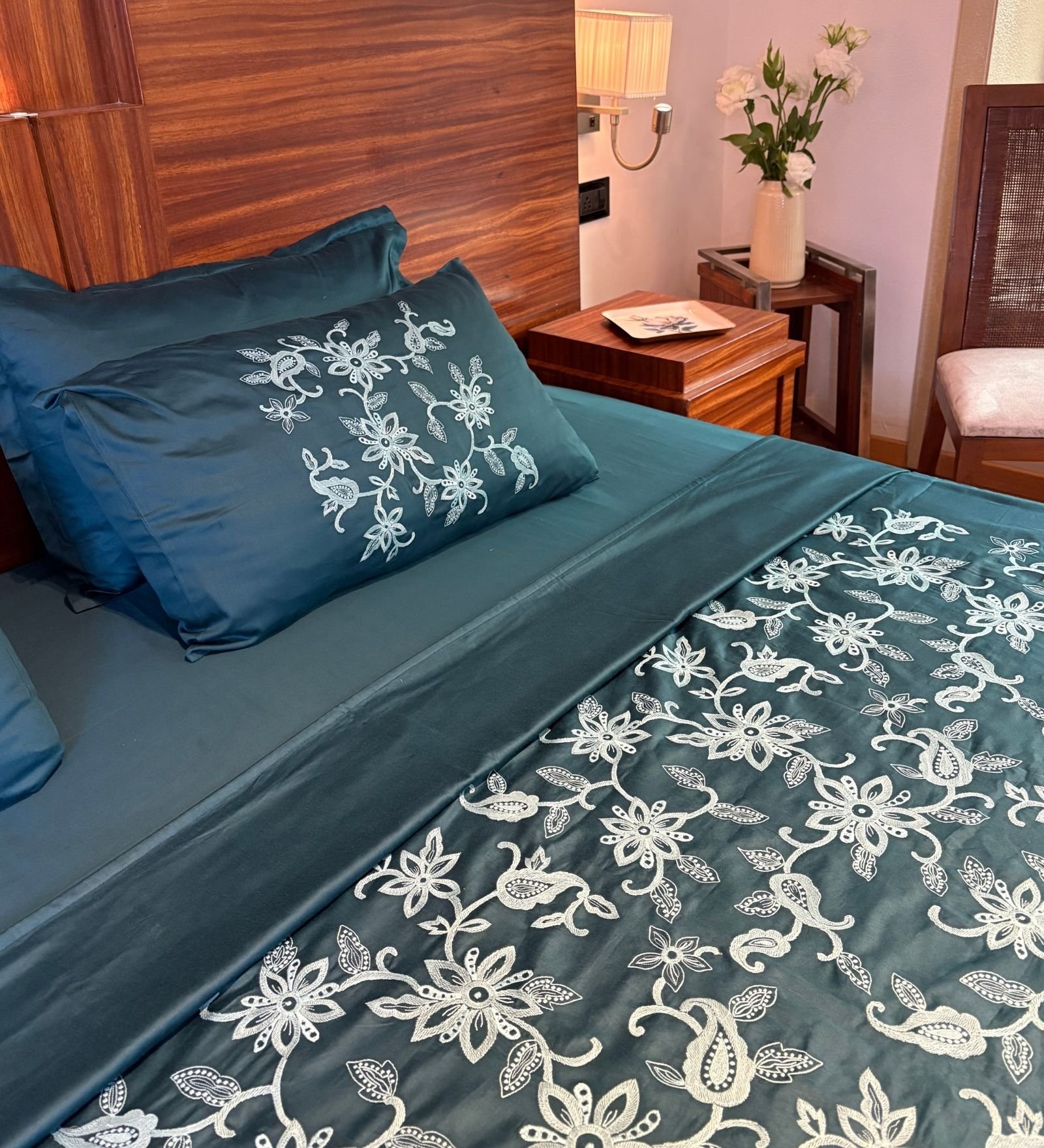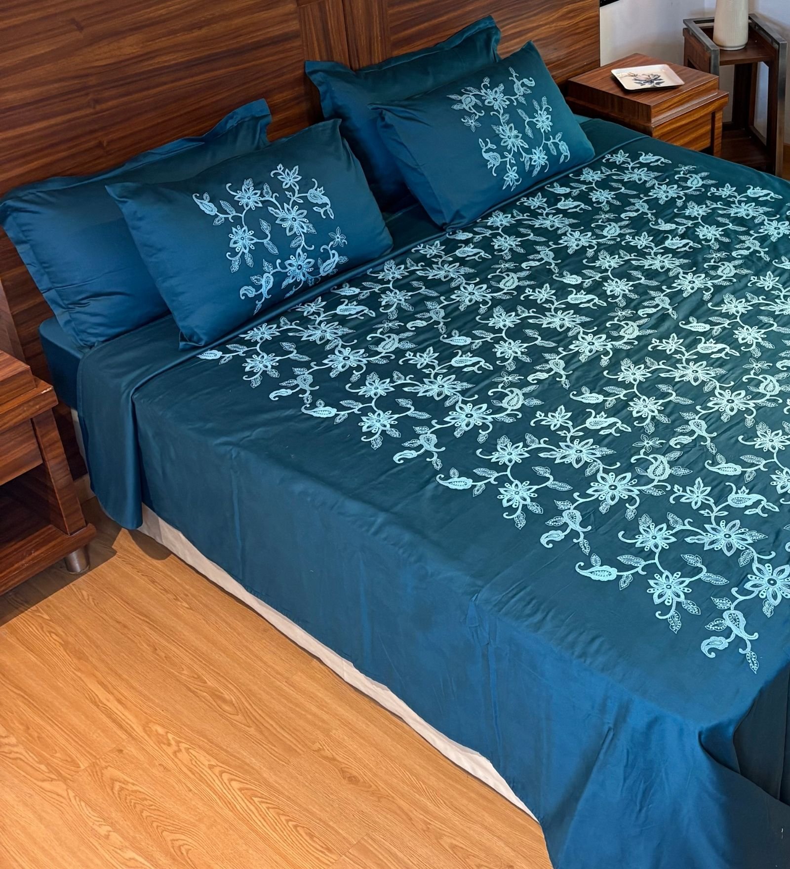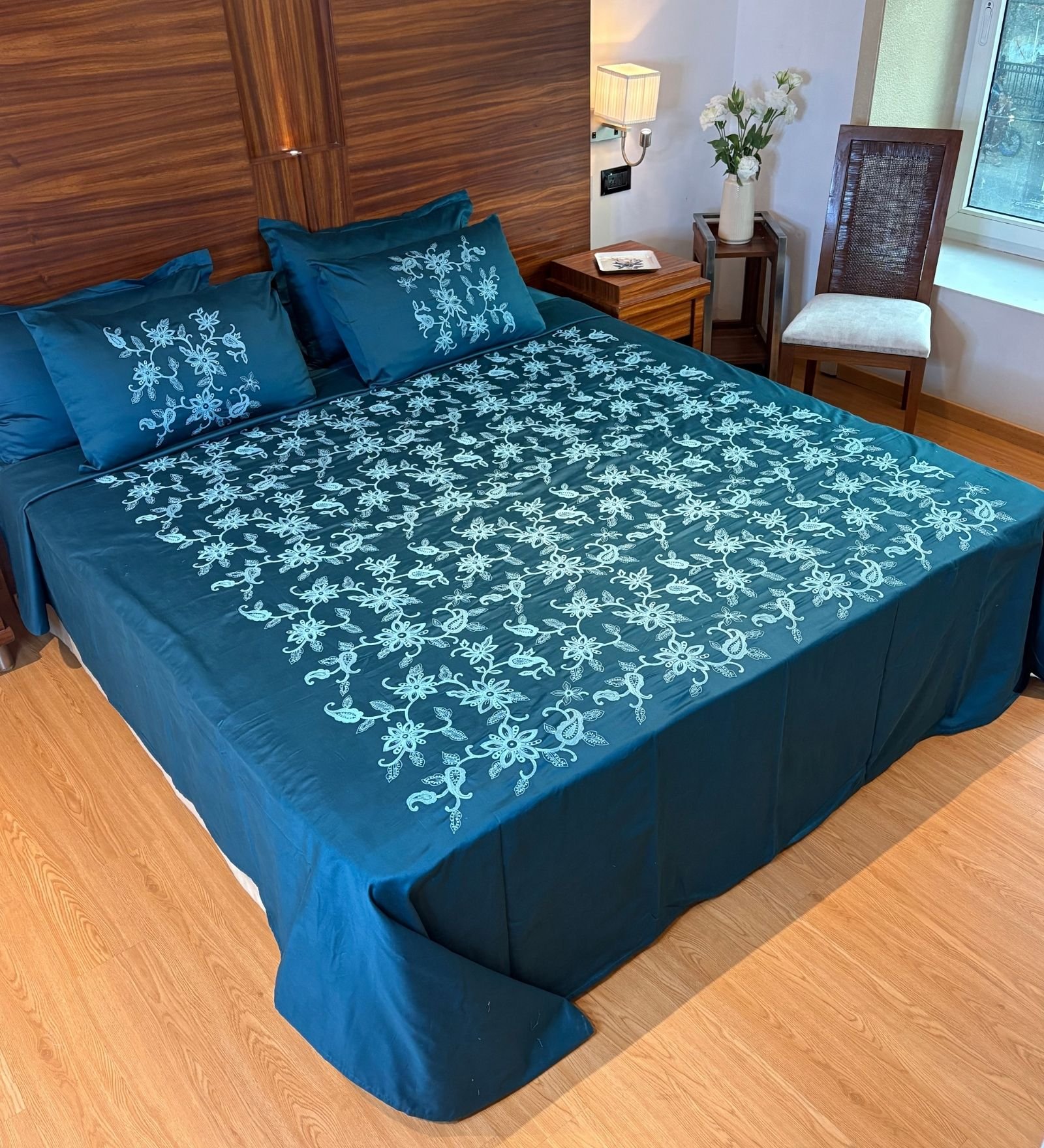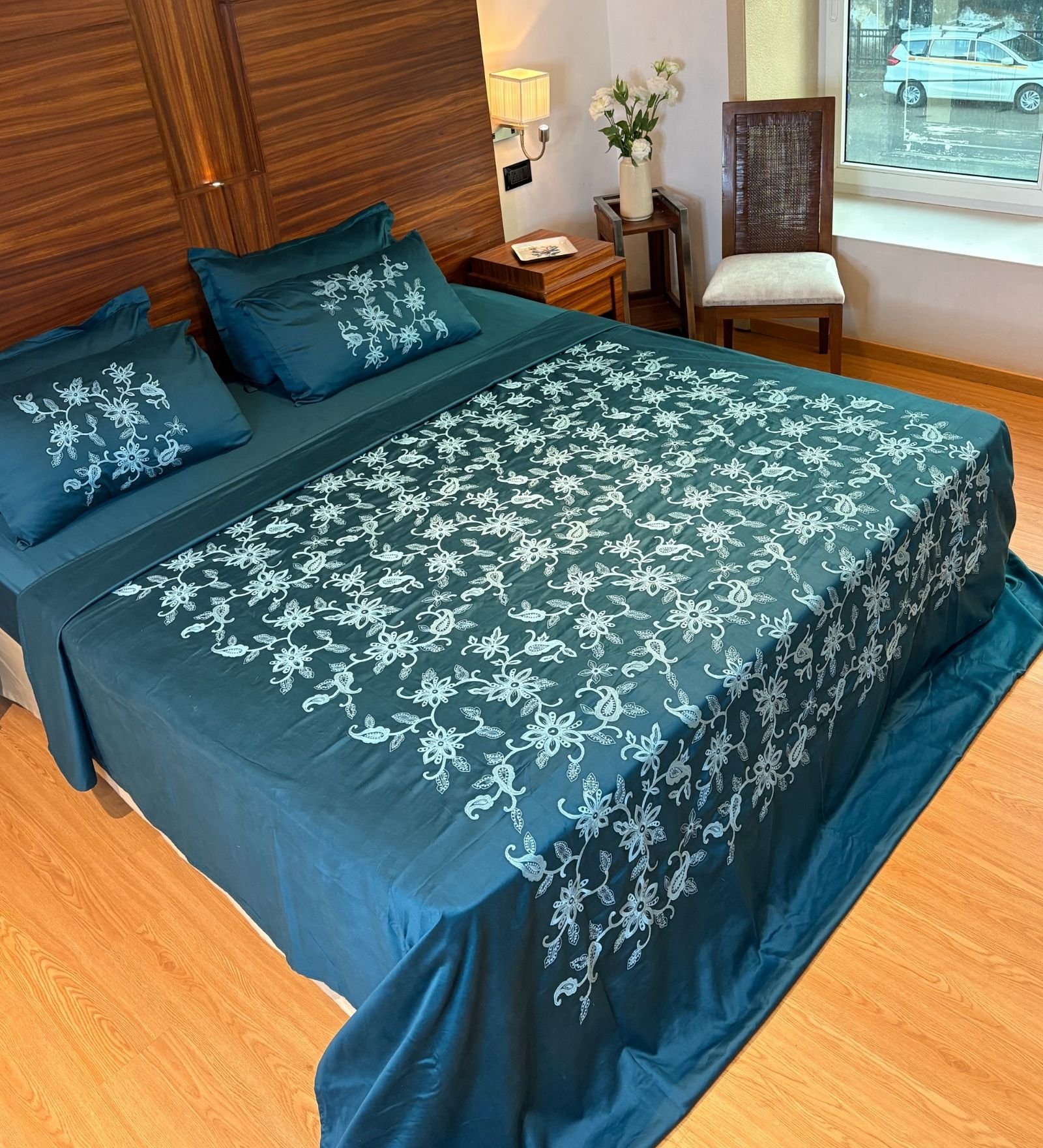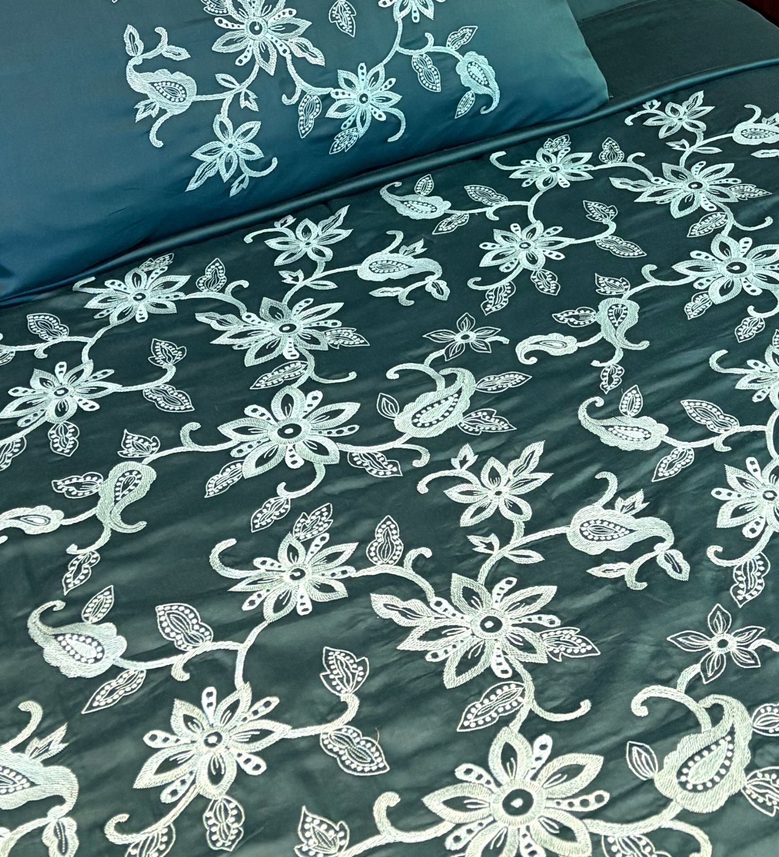 Velora Teal Cotton Sateen Embroidered Bedcover