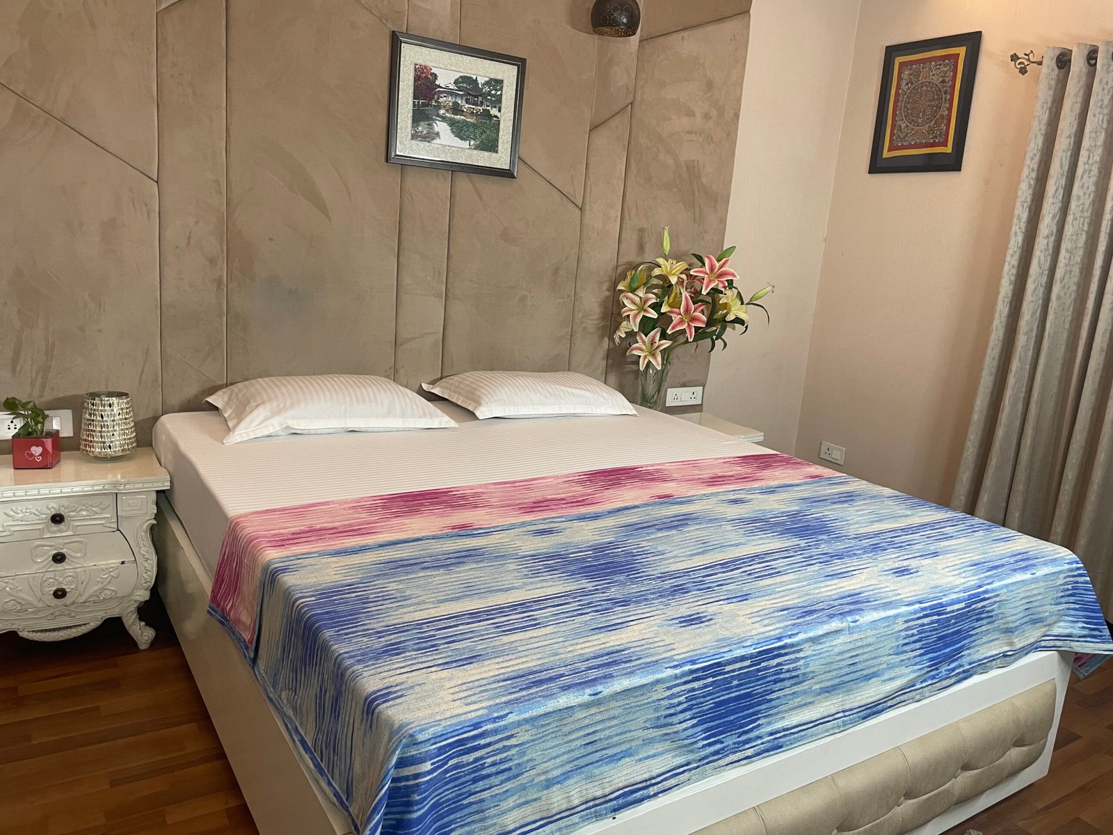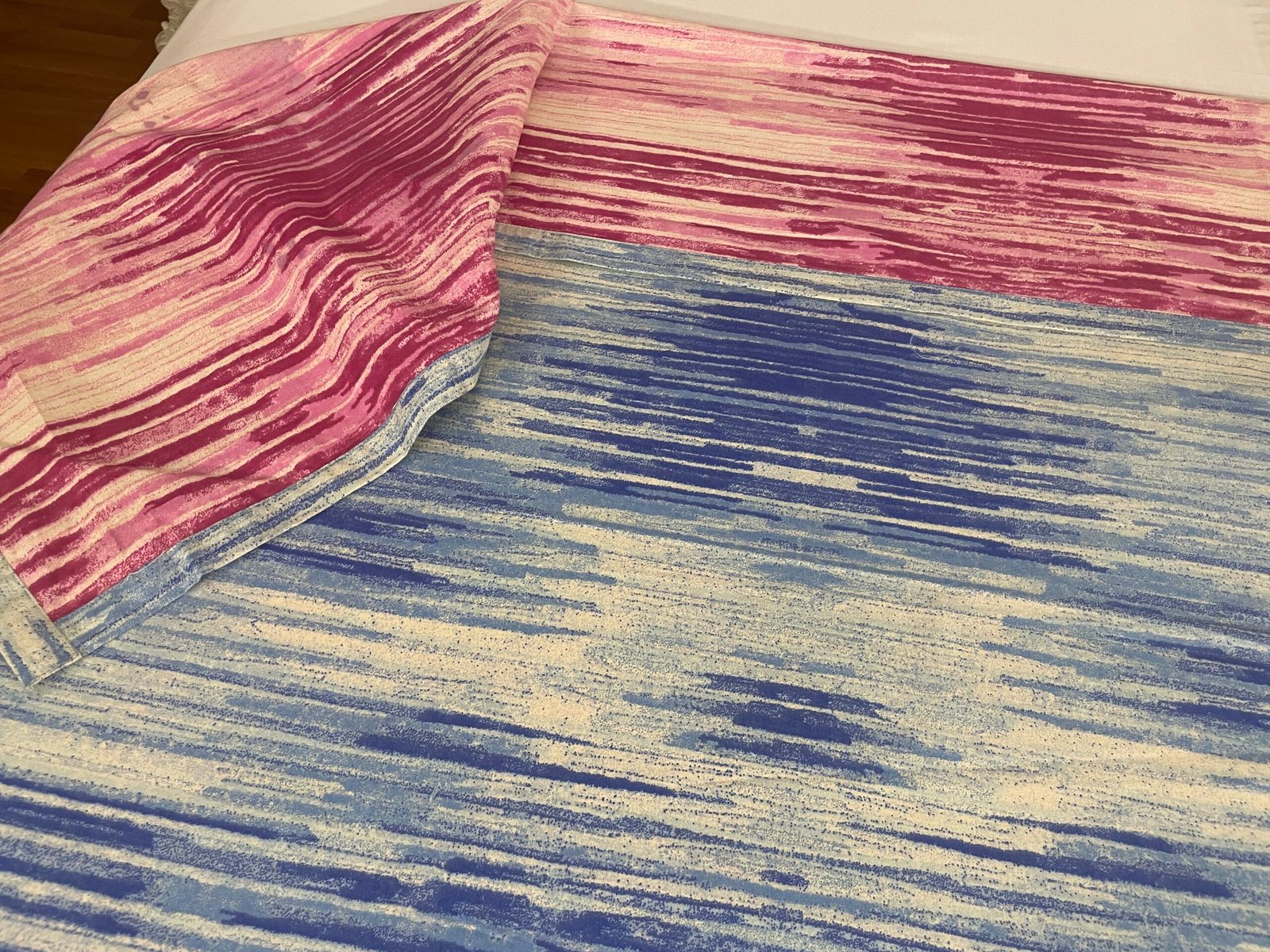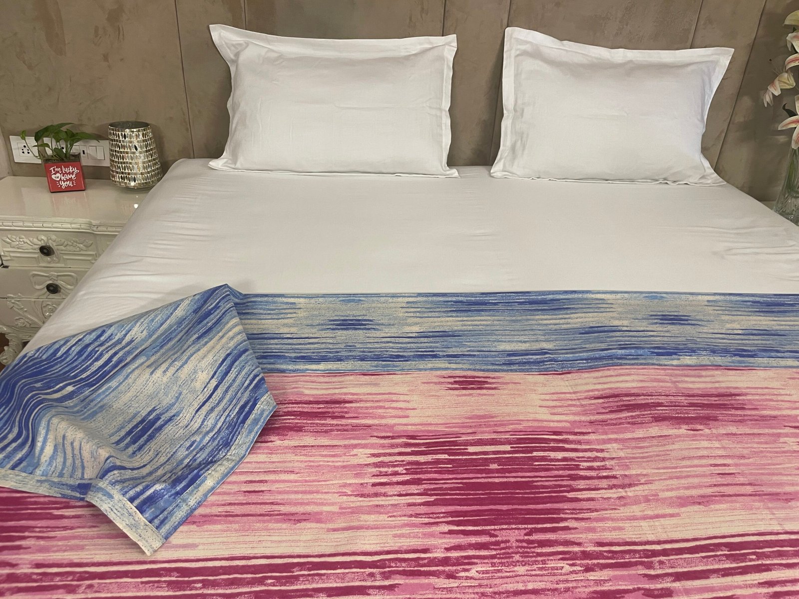 Our dohars, made by stitching two cotton sheets together, make a sleek bedlinen. It is ideal for when the cool night winds blow and you need a little more than a cotton sheet to keep you warm but not something as padded as a quilt. It also makes an ideal bedding throughout the year when you have the A.C turned on and the temperature is a cool 21 to 24 degrees Celsius. Playing with patterns is one of the most enjoyable part of a bedroom design scheme, you can pick out colors from our Dohar patterns when choosing your bedding and other decorative accessories. Our reversible Dohars can be folded back if you don’t want to smoothen it beneath your pillows. The pretty design on the underside complements the upper side and allows for more visual layering of your bedlinen.