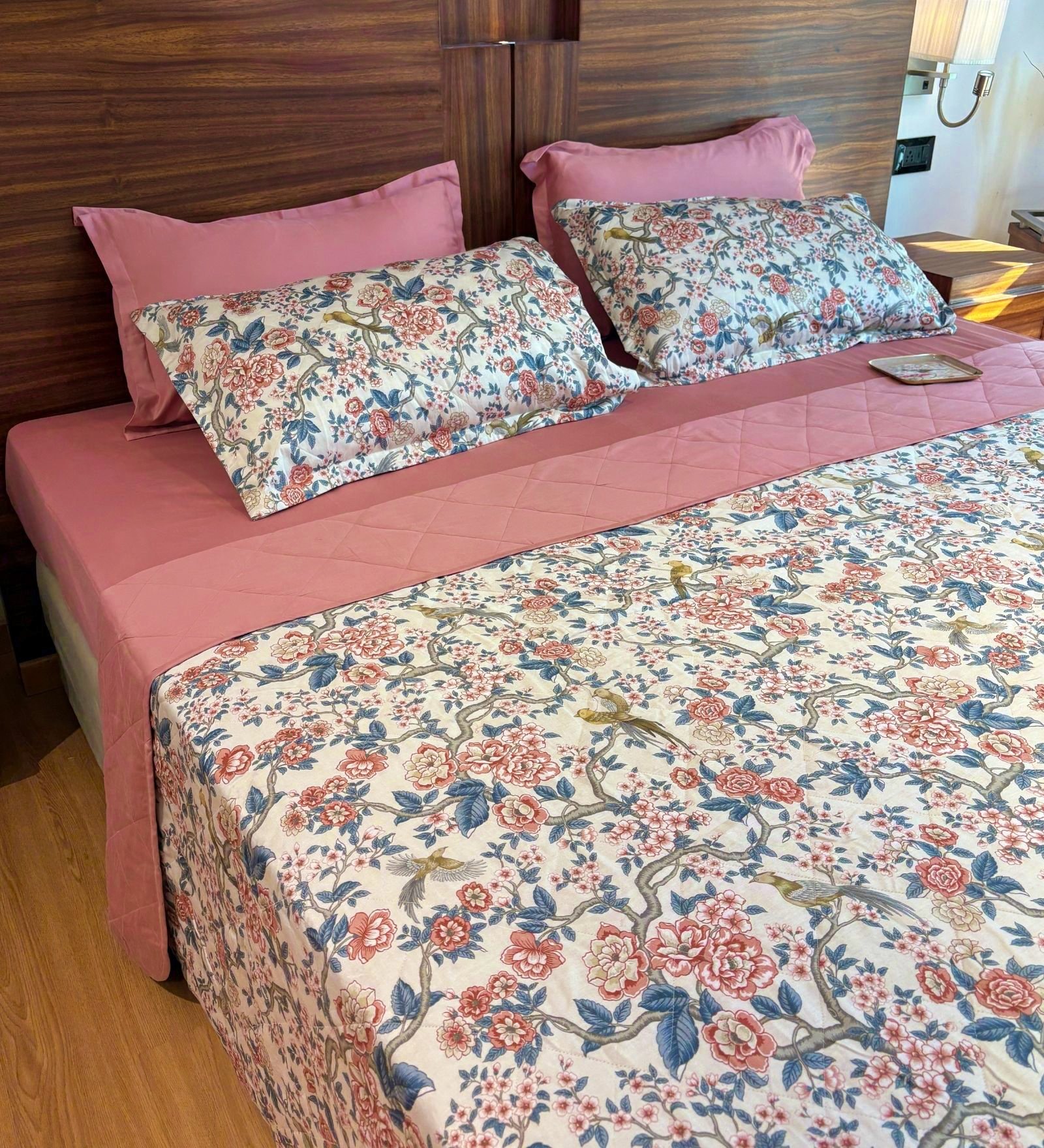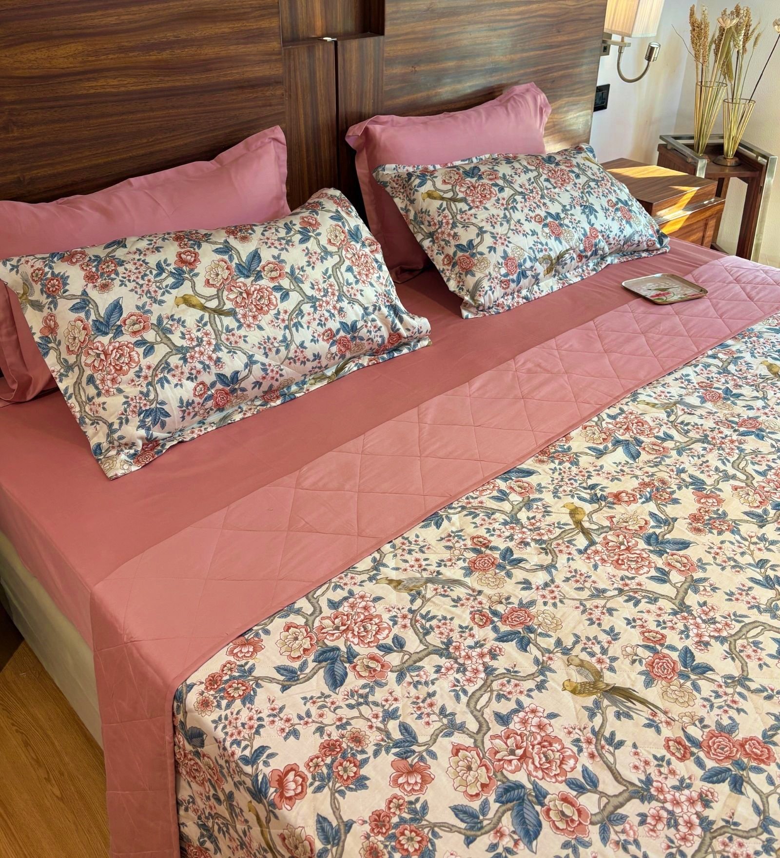 Bring refined charm and understated luxury to your bedroom with our reversible AC comforter cum quilted bedcover. One side flaunts a rich solid hue for a bold, contemporary vibe, while the reverse showcases an exquisite botanical print with birds and florals in soft, colourful tones — perfect for a nature-inspired look. Lightly quilted for comfort and crafted for year-round usability, it drapes beautifully as a bedspread while doubling as a breathable comforter on cooler nights. A statement piece that seamlessly blends utility with timeless style.